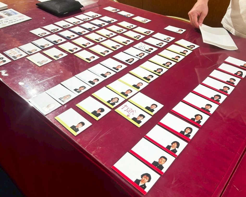 卒業して34年ぶり。(久しぶりに皆と会える!楽しみ!)(誰だかわかるかな?昔みたいに話せるかな?)期待と不安が入り混じりながら受付を開始。そこで胸につける名札にはひと工夫、(えっ?この人誰だった?)とはならないように、名札に参加者の当時の写真を貼り付けました。何ならクラス別に色分けも。